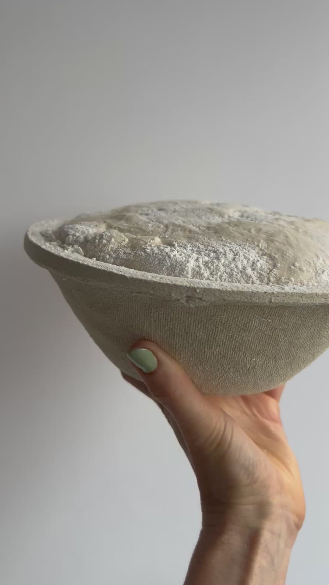 For best results, upon receiving your new banneton, and before your first bake, preheat your oven to 170C and turn it *off* after 3 minutes. Place the empty wood pulp banneton in the warm oven 20 minutes, then remove it from the oven and allow it to cool off completely. It will then be completely dried out and clean. Coat it with plenty of GF flour and you’re all ready to go!