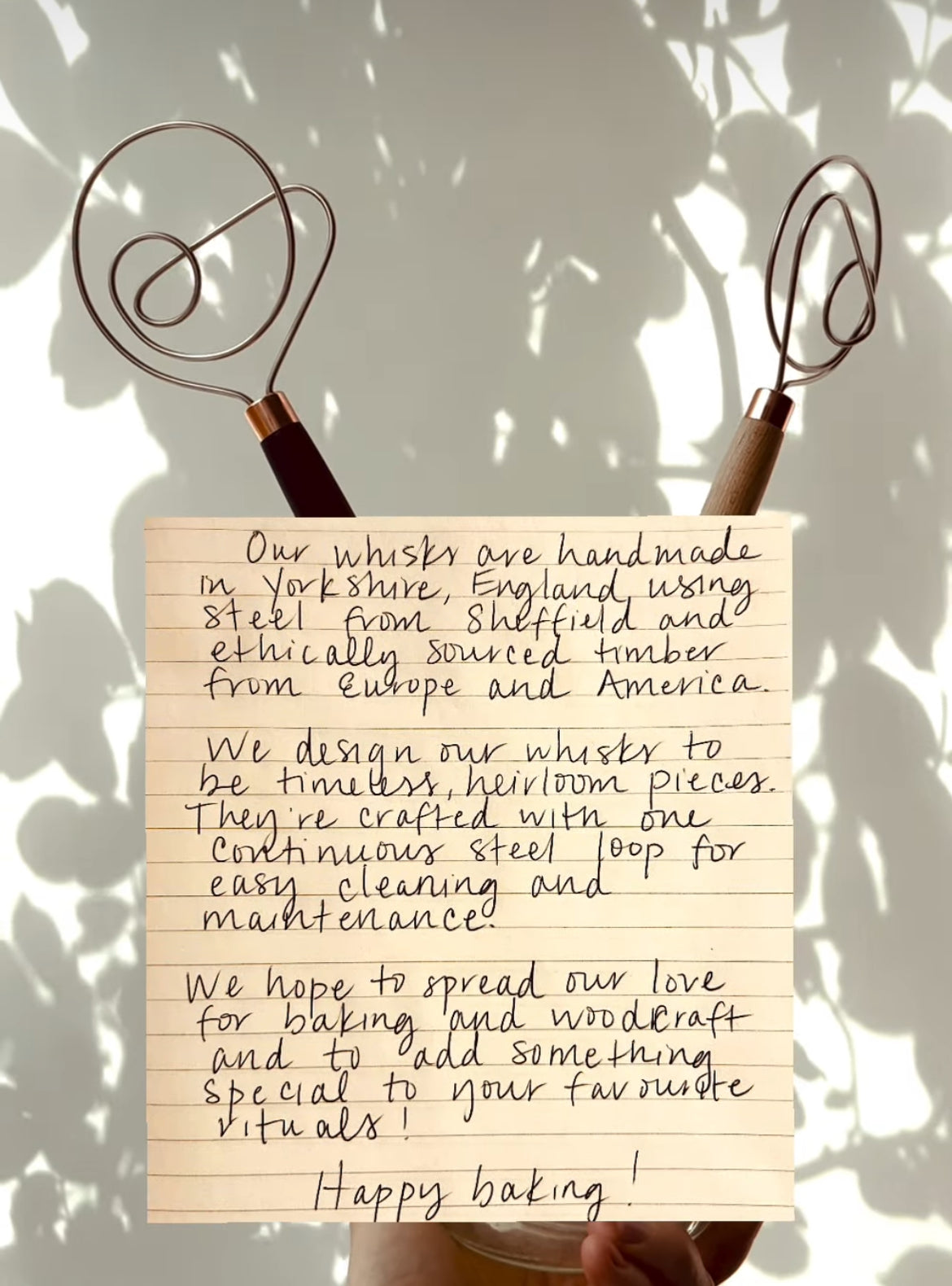 Each of our items is made with sustainably sourced timber and ultra durable stainless steel from Sheffield. And the whisk also features a cuff made from anodized brass which looks like copper but will not tarnish.