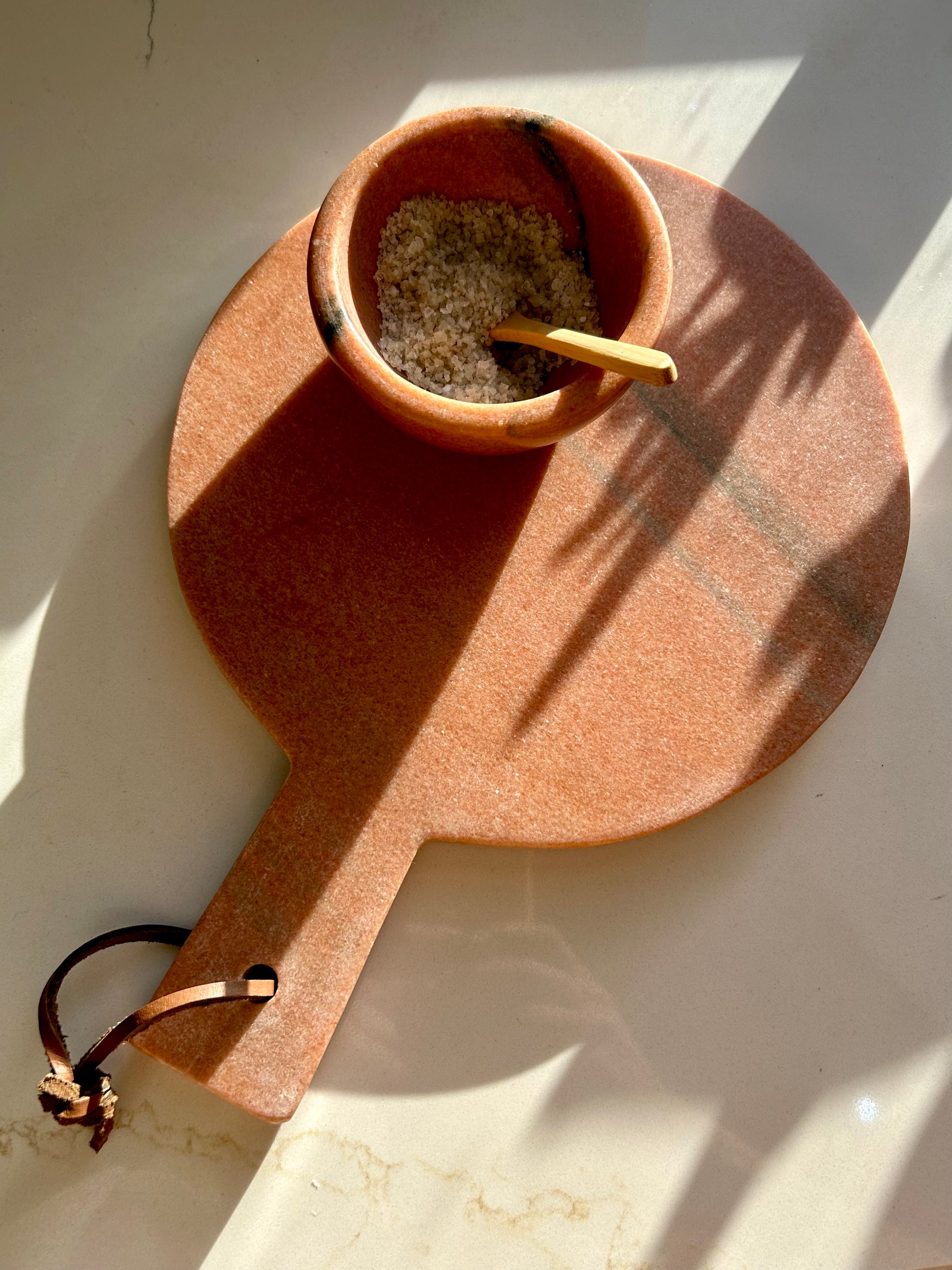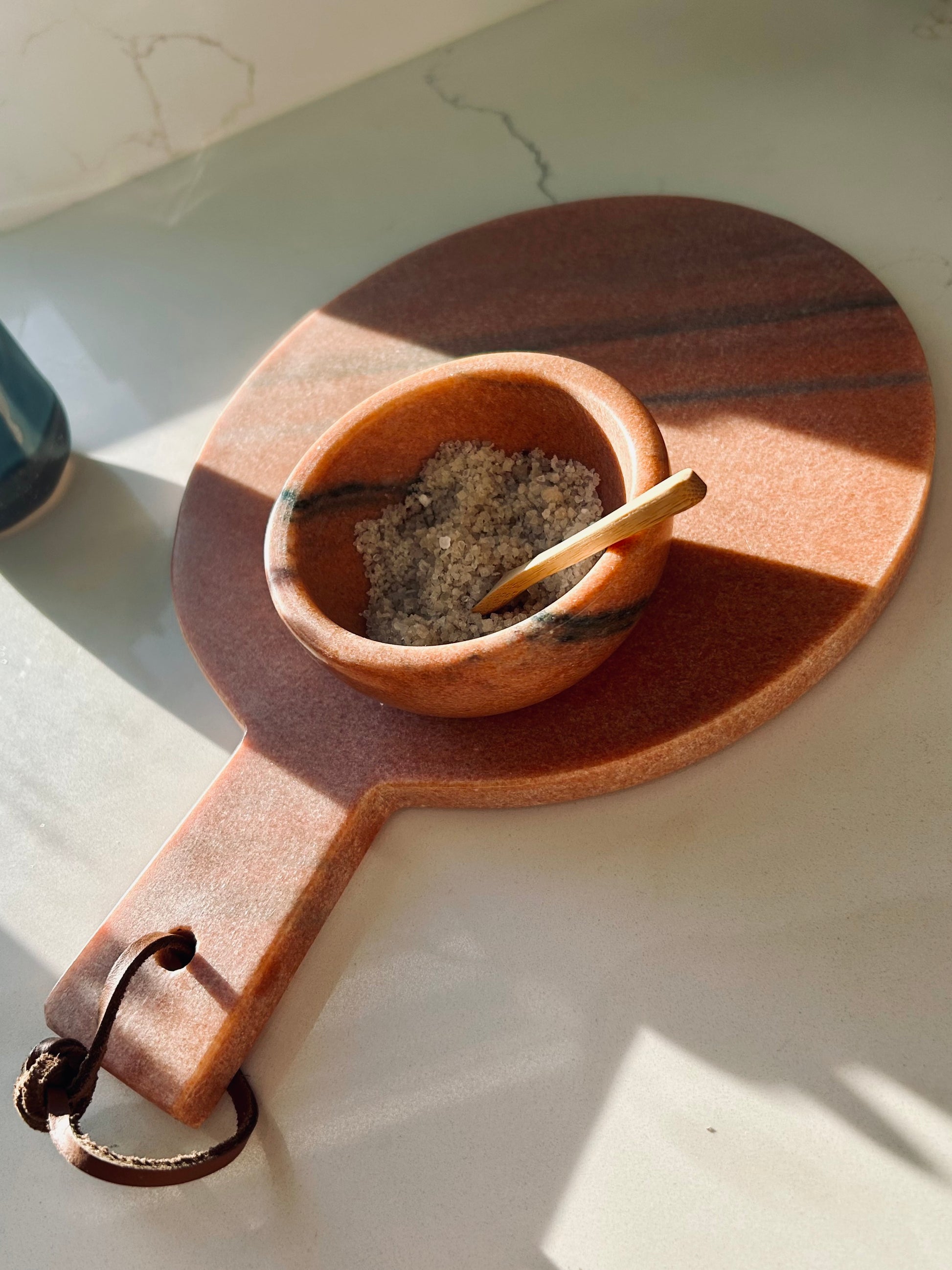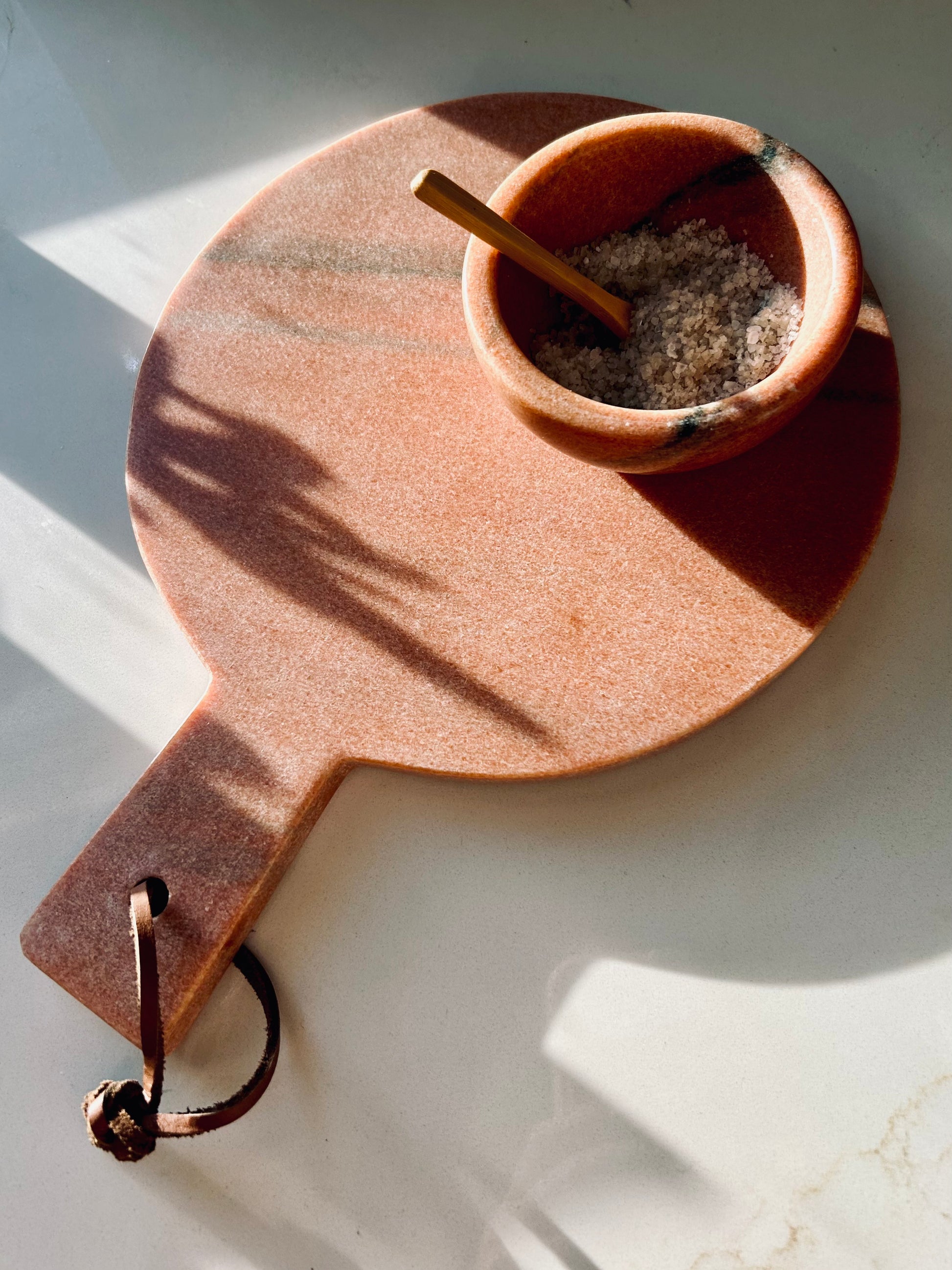 Coral pink marble chopping / charcuterie / crudités / bread boards are now available! And they perfectly match our salt bowls!