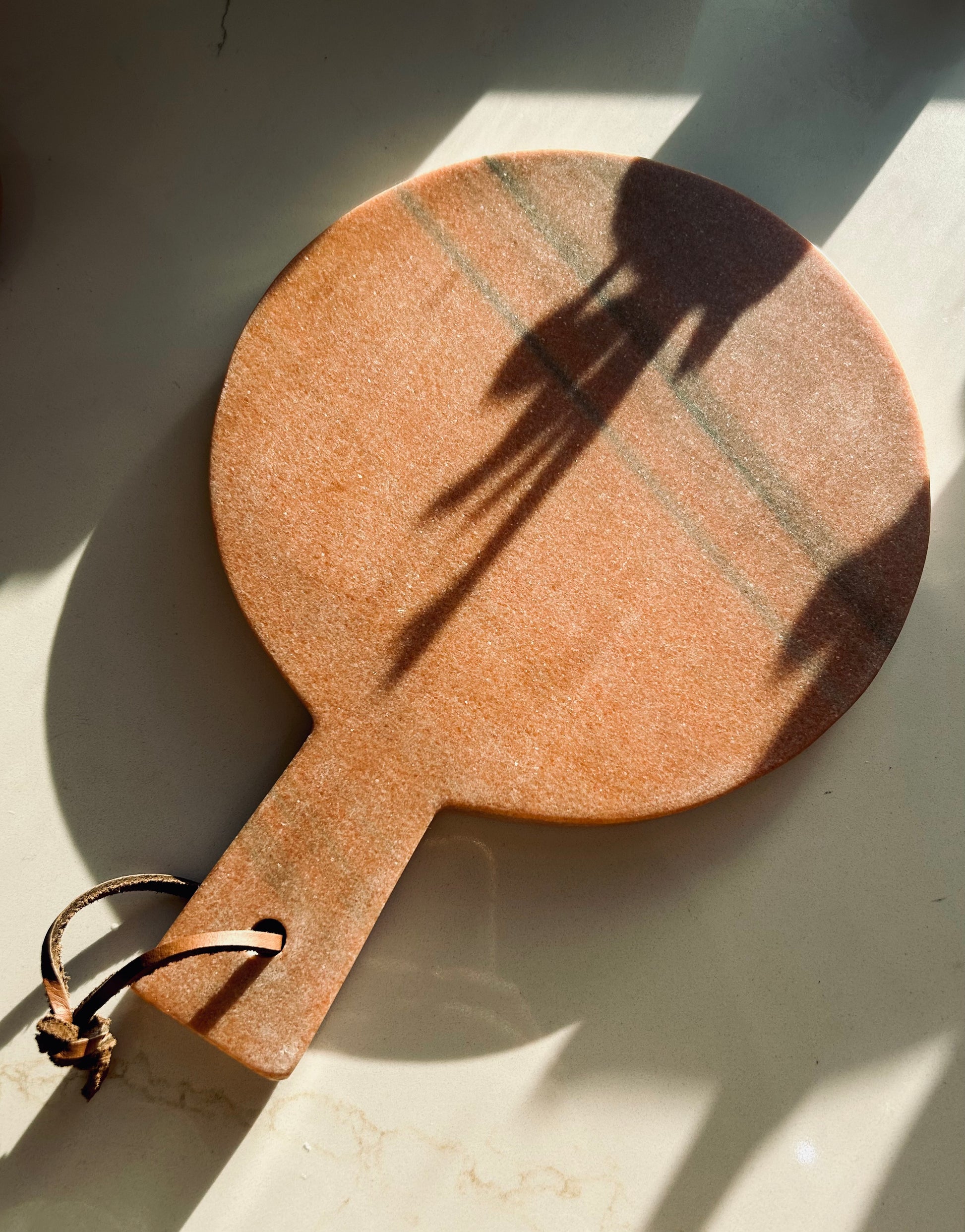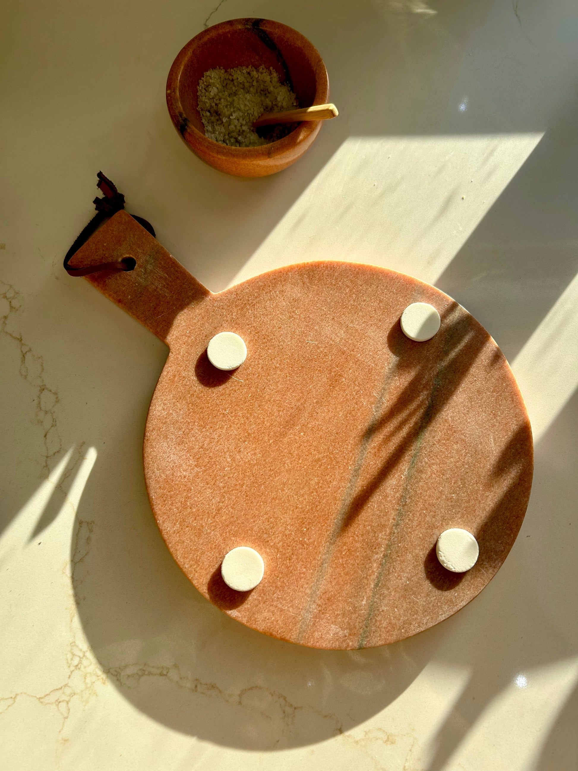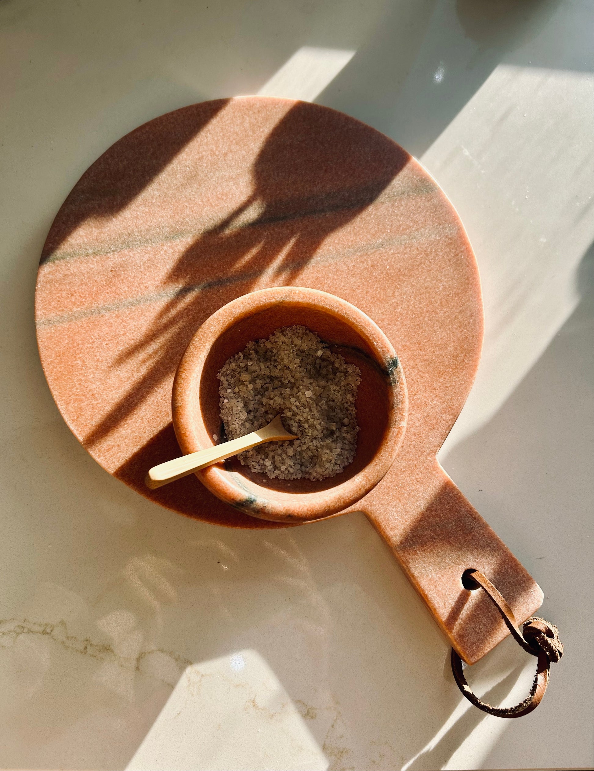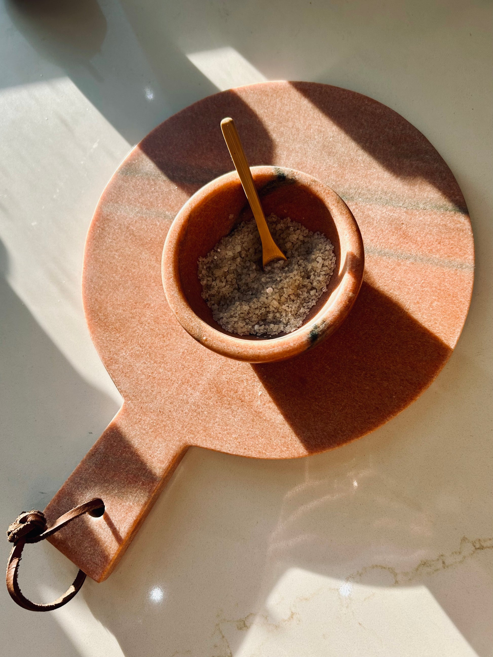 Coral pink marble chopping / charcuterie / crudités / bread boards are now available! And they perfectly match our salt bowls!