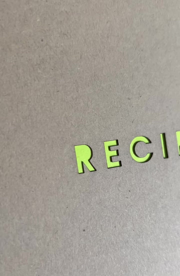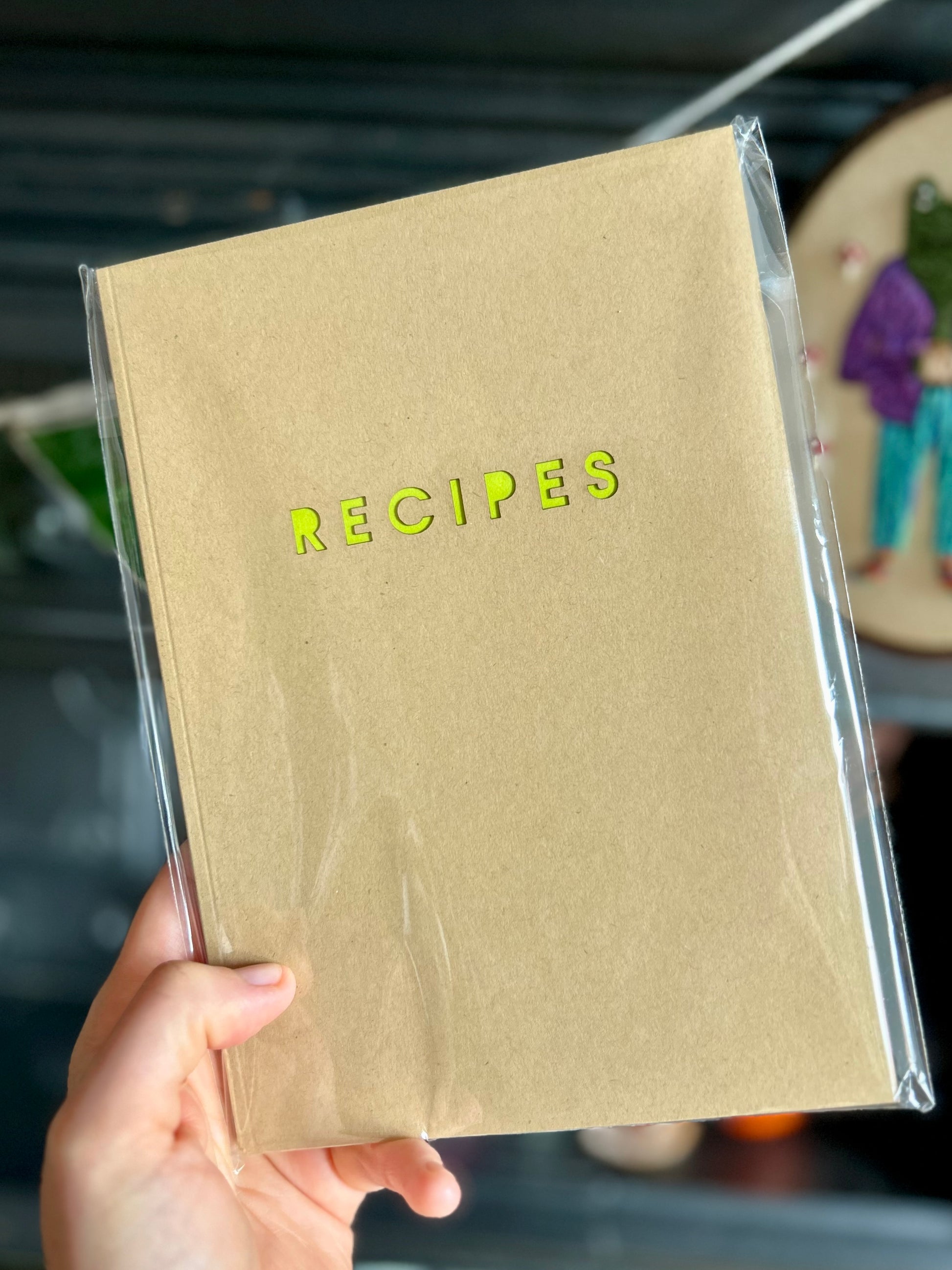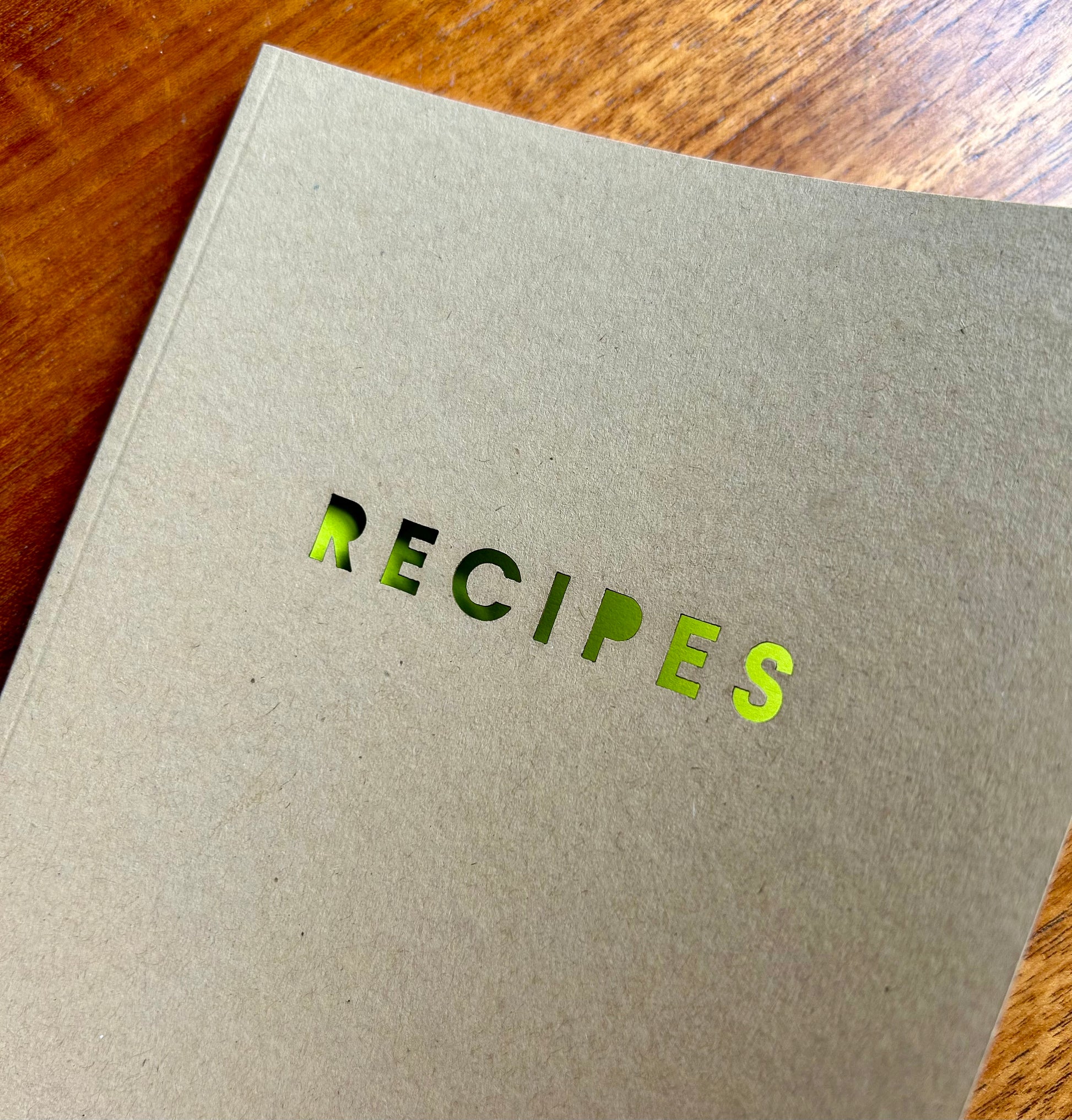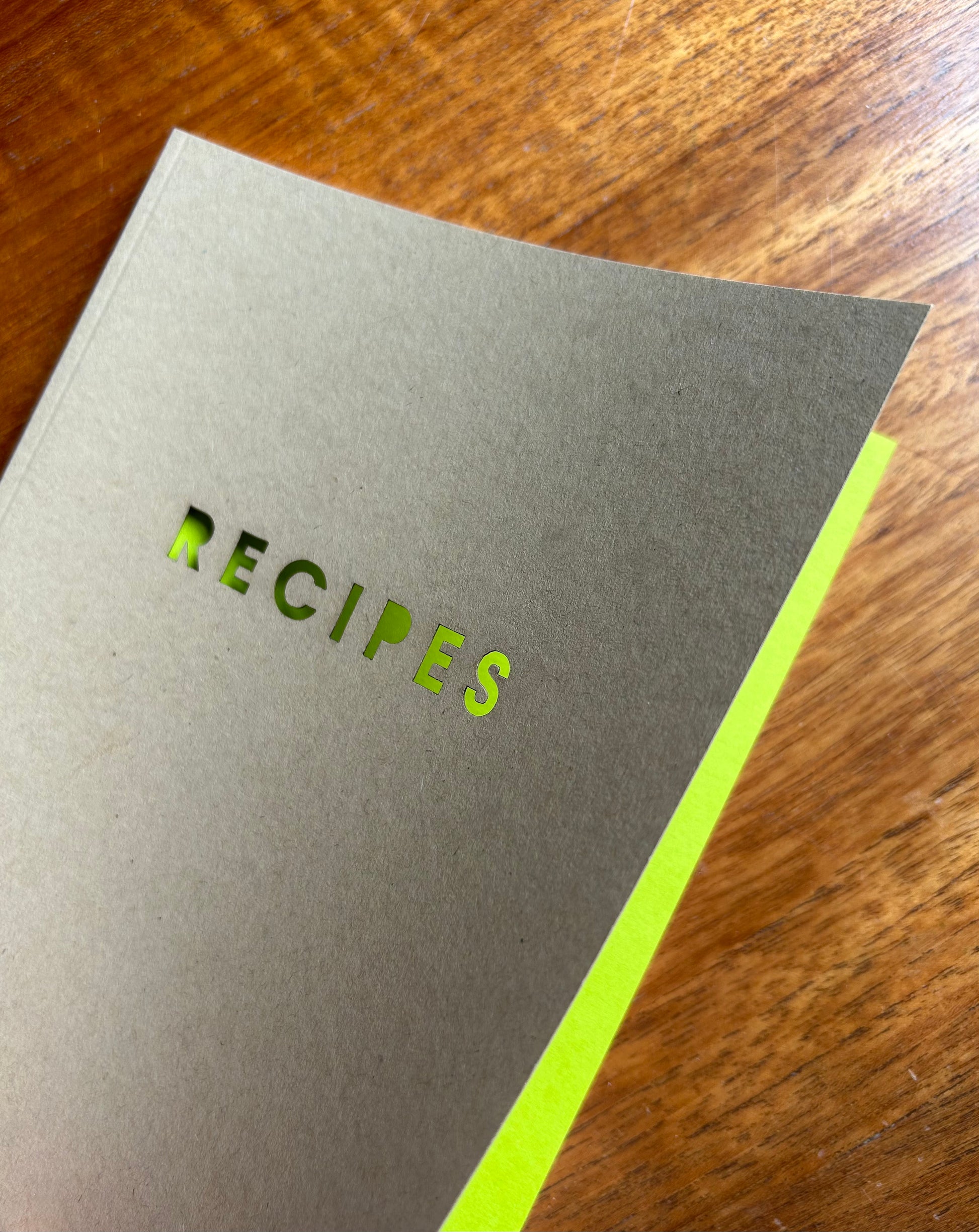 Handmade Recipe Notebook with cut-out RECIPES cover design revealing the bright green inside cover.