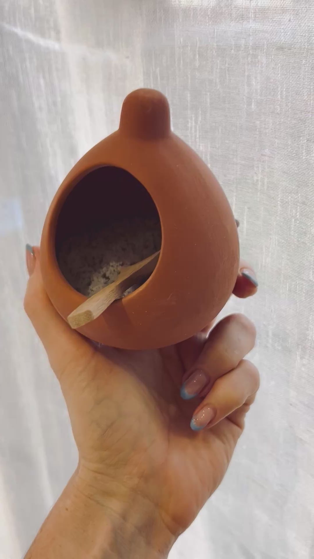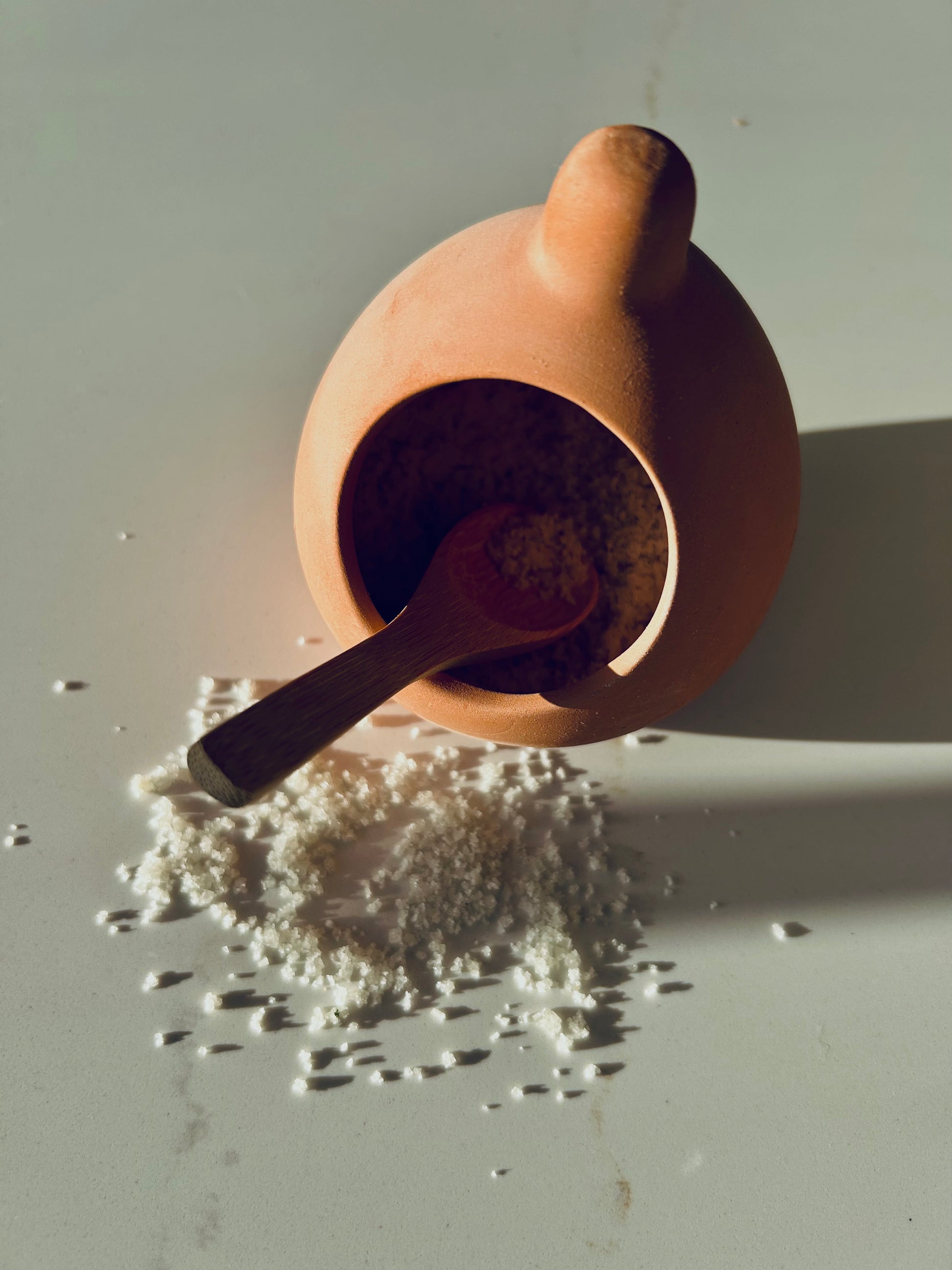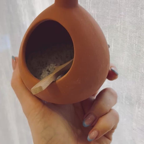 Crafted from unglazed terracotta, the vessel naturally absorbs moisture, keeping your salt dry, free-flowing, and perfectly preserved. Its wide, open-mouth design makes it easy to pinch, scoop, and season as you cook.