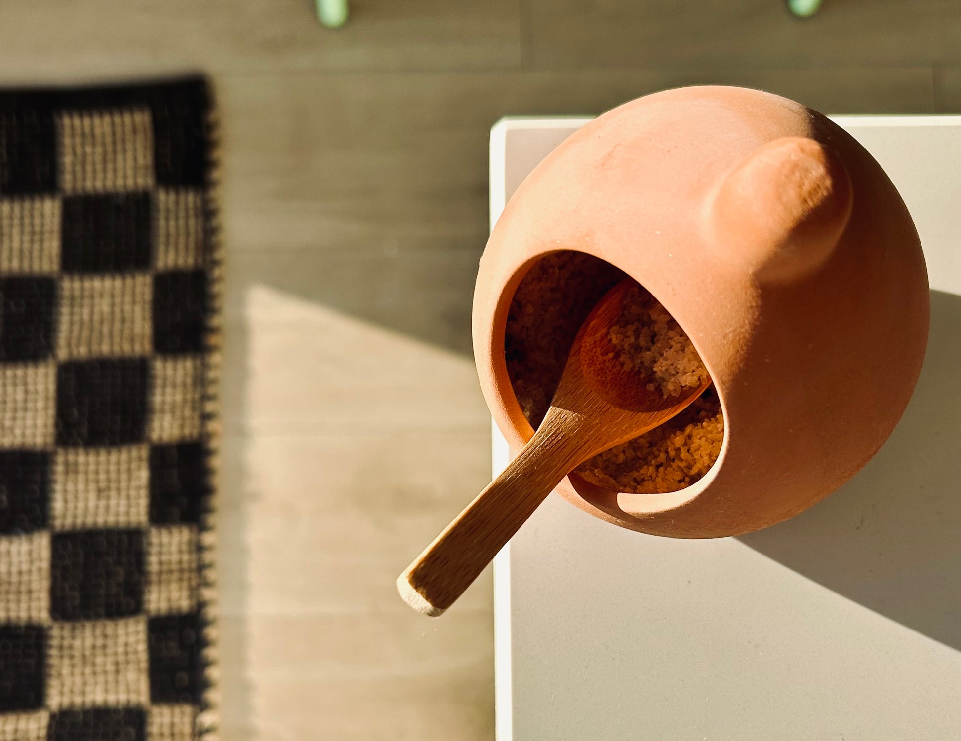 This charming traditional terracotta vessel brings both character and convenience to your kitchen. Complete with a natural bamboo spoon, it offers an inviting, rustic way to keep your favorite salt close at hand.